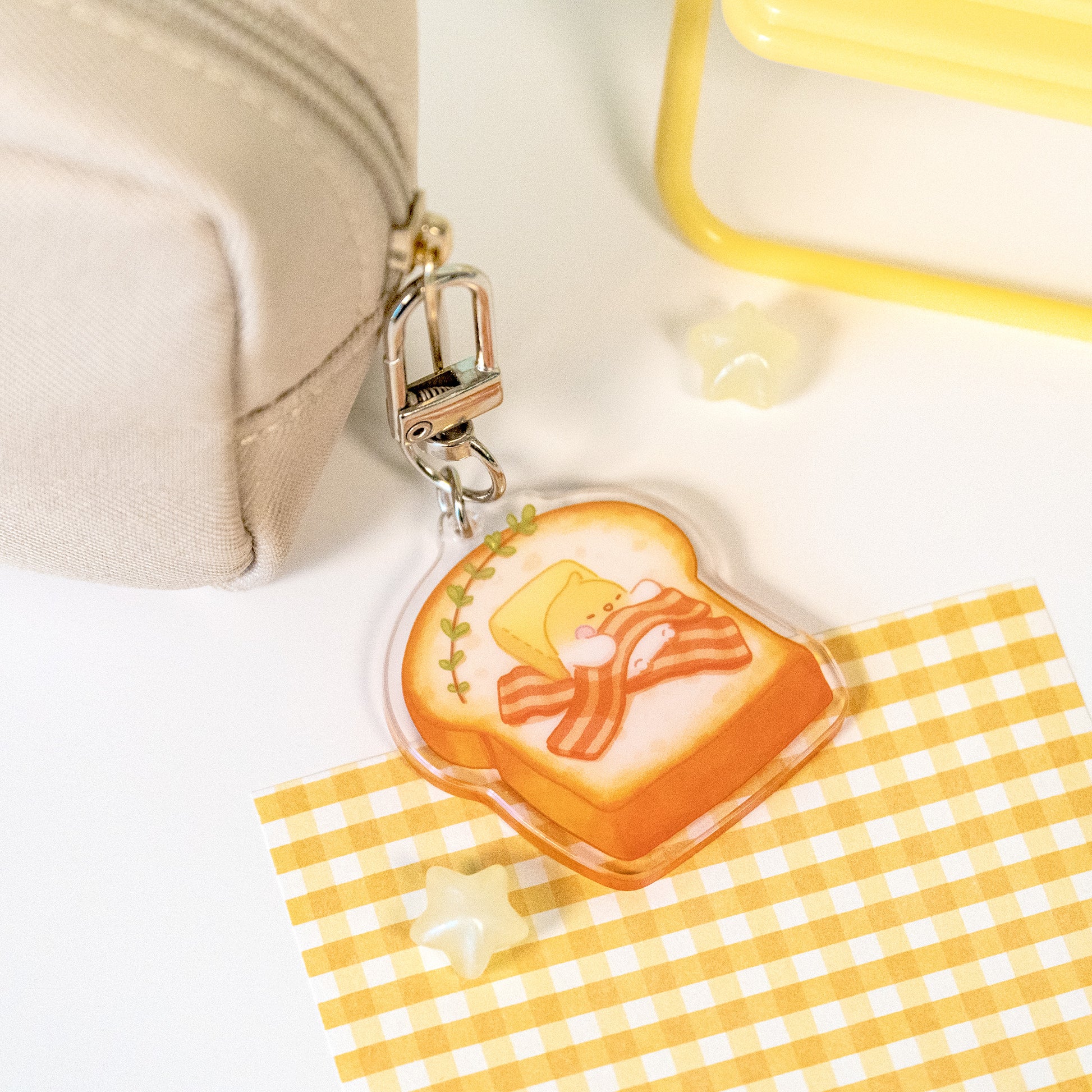 Sweet Dreams キーホルダーには、マフィン コーナーのキャラクターがお気に入りの食べ物の上で眠っている様子が描かれています。デヴィエッグは夜遅くまで仕事をした後、温かいトーストを食べながら眠っています。